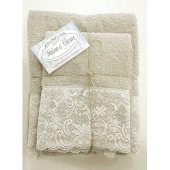 Biancheria e asciugamani gratuiti. Impreziositi da bordo in tessuto e trina, confezionato in scatola, ottima idea regalo.